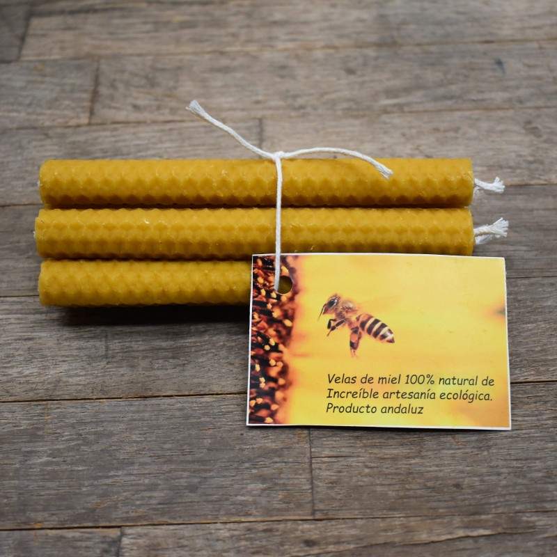 Velas de miel artesanales, las originales, elaboradas a partir de 100% pura miel de abeja. Producto tradicional andaluz. Utilizadas comúnmente para atraer la prosperidad los días 11 y 22 de cada mes. Formato: 1 pack x 3 velas medidas 10x 2cm aproximadamente